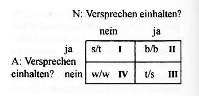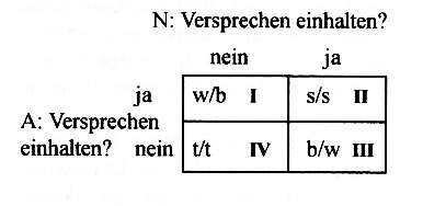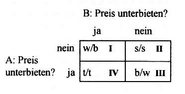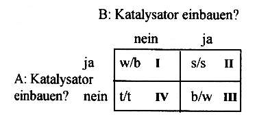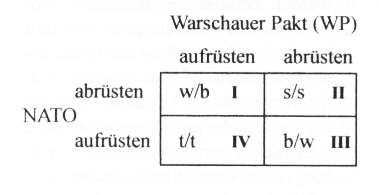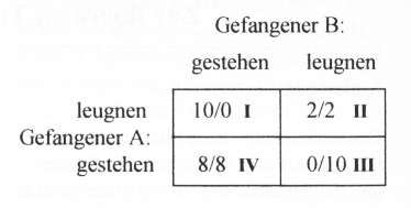 Erläuterung: Die Zahl vor dem Querstrich gilt für A, die Zahl danach für B. Die römischen Ziffern bezeichnen den Quadranten, d.h. das soziale Ergebnis, das sich als Resultat individueller Strategien einstellt. Abbildung 1: Die Auszahlungsmatrix für das Gefangenendilemma Wie werden sich die beiden Gefangenen in unserem Modell verhalten? Unterstellt man, daß es sich bei den Gefangenen um rationale Akteure handelt, die jeweils ihre individuelle Haftstrafe so gering wie möglich halten wollen, dann hat dieses Modell eine eindeutige Lösung. Versuchen wir, der Logik dieser Situation auf die Spur zu kommen, indem wir sie zunächst aus der Perspektive des Gefangenen A durchdenken: Falls B gesteht, kommt die Strategiewahl für A der Wahl zwischen acht und zehn Jahren Gefängnis gleich. Er wird sich also für ein Geständnis entscheiden. Falls hingegen B leugnet, kommt die Strategiewahl für A einer Wahl zwischen zwei und null Jahren Gefängnis gleich. Wiederum also wird er sich zum Geständnis entschließen. Unabhängig davon, wie B sich verhält, ist es für A immer vorteilhaft, auf die Kronzeugenregelung zu setzen. Da das Spiel symmetrisch aufgebaut ist, gelten die gleichen Überlegungen analog für B. Auch der Gefangene B wird sich für ein Geständnis entscheiden. Diese Strategie ist aus seiner Sicht die jeweils beste Antwort auf die Strategie, die A wählt. Da beide Gefangenen gestehen werden, stellt sich als Ergebnis Quadrant IV ein. Dieses Ergebnis ist nun aber äußerst bemerkenswert, wie ein Vergleich mit Quadrant II zeigt: Beide Gefangenen hätten mit einer geringeren Haftstrafe davonkommen können, wenn sie sich anders entschieden hätten. Genau hier liegt nun die Pointe des Modells. Es bildet eine Situation ab, in der rationale Akteure zugleich gemeinsame und gegenläufige Interessen haben, wobei die Situation so vertrackt ist, daß die gegenläufigen Interessen das gemeinsame Ziel unterminieren. Beide Gefangenen hätten im Prinzip mit je zwei Jahren davonkommen können. Hierfür wäre ein beiderseitiges Leugnen nötig gewesen. Dies wird jedoch durch die situativen Verhaltensanreize vereitelt. Wer leugnet, läuft Gefahr, vom anderen ausgebeutet zu werden und sich die Höchststrafe einzuhandeln. Gegen diese Gefahr kann er sich nur dadurch schützen, daß er selbst leugnet. Zugleich hält er sich damit die Option auf den für ihn günstigsten Fall offen, nämlich als Kronzeuge freigelassen zu werden. Es sind diese individuellen Vorteils-Nachteils-Kalkulationen, die zwingend dazu führen, daß das gemeinsame Ziel nicht erreicht wird und daß die beiden Gefangenen unter ihren Möglichkeiten bleiben. Insofern ist die Bezeichnung Gefangenendilemma durchaus treffend. Das Modell bildet eine Rationalfalle ab, eine Falle, in der sich rationale Akteure gezwungen sehen, sich wechselseitig zu schädigen. Bevor im folgenden darauf eingegangen wird, inwiefern diese merkwürdige Situationsstruktur zum Verständnis der modernen Welt beitragen kann, wollen wir folgende Einsichten aus dem Modell ausdrücklich festhalten. 1. Die Ergebnisse des modellierten Spiels können nicht gewählt werden. Gewählt werden können nur Strategien, d.h. individuelle Handlungen. Folglich kann kein Akteur allein den Quadranten bestimmen. Welcher Quadrant realisiert wird, hängt immer auch davon ab, wie sich der jeweils andere verhält. 2. Jeder Akteur verfolgt mit seiner Handlung seinen eigenen individuellen Vorteil. Er intendiert eine möglichst geringe Haftstrafe. Tatsächlich jedoch handelt er sich eine hohe Haftstrafe ein. Jedenfalls wäre eine niedrigere Haftstrafe prinzipiell möglich gewesen. In diesem Sinne ist das Ergebnis ein nicht-intendiertes Resultat individueller Handlungen. Das Ergebnis ist sub-optimal, obwohl jeder Akteur ein für sich optimales Ergebnis zu erreichen versucht. 3. Das gemeinsame Interesse wird von individuellen Anreizen dominiert. Das Ergebnis ist eine kollektive Selbstschädigung. Beide Gefangenen bleiben unter ihren Möglichkeiten. II. Gesellschaftliche Dilemmastrukturen: eine Interaktions-Theorie Wir vertreten die Auffassung, daß das Gefangenendilemma eine Situationslogik abbildet, deren genaue Kenntnis ein Verständnis zahlreicher Politikprobleme in modernen Gesellschaften erleichtert. Wir möchten diese These im folgenden an einigen Beispielen illustrieren. (1) Das Problem des Kalten Krieges bestand darin, daß NATO und Warschauer Pakt (WP) vor der Alternative standen, aufzurüsten oder abzurüsten. Zwar gab es ein gemeinsames Interesse an kollektiver Sicherheit. Zugleich gab es aber auch enorme Anreize, durch individuelles Vorteilsstreben sich wechselseitig zu schädigen. Betrachten wir hierzu Abbildung 2. Erläuterung: Der Buchstabe vor dem Querstrich gilt für NATO, der danach für WP. Hierbei steht b für best, s für second, t für third und w für worst. Aus Sicht jedes Akteurs gilt folglich b > s > t > w. Abbildung 2: Der kalte Krieg als soziales Dilemma Wenn beide Staaten abrüsten, können sie kollektive Sicherheit mit relativ niedrigen Kosten erzielen. Es besteht also ein gemeinsames Interesse daran, Quadrant II zu erreichen. Aus Sicht der NATO bestünde jedoch der individuell beste Fall darin, Quadrant III zu erreichen, d.h. eine militärische Überlegenheit über den potentiellen Gegner aufzubauen. Der individuell schlechteste Fall hingegen wäre Quadrant I. Hier würde man dem Warschauer Pakt das Feld überlassen und durch militärische Schwäche erpreßbar werden. Den drittbesten Fall bildet ein Gleichgewicht des Schreckens, wie es durch Quadrant IV wiedergegeben wird. Unter diesen Bedingungen ist beiderseitige Aufrüstung das Ergebnis rationaler Strategien. Jeder Akteur hat berechtigte Angst davor, daß seine Vorleistung ausgebeutet werden könnte. Das Resultat ist eine kollektive Selbstschädigung in Form milliardenschwerer Rüstungsprogramme, die die Welt nicht sicherer machen. Jedenfalls wäre das gleiche Sicherheitsniveau auch zu niedrigeren Kosten erreichbar