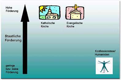 4. "Trennung von Staat und Weltanschauung", "dritte Konfession" oder "Leitkultur Humanismus und Aufklärung"? Unterschiedliche Konzeptionen zum Verhältnis von Staat und Weltanschauung Bilder sagen häufig mehr als Worte. Um das bisher Vorgetragene zu vertiefen, möchte ich nachfolgend die verschiedenen Modelle des Verhältnisses von Staat und Weltanschauung anhand einiger einfacher Grafiken illustrieren. 4.1 Das real existierende Modell der staatlichen Privilegierung der Großkirchen Bezogen auf die drei zahlenmäßig bedeutendsten weltanschaulichen Gruppen in Deutschland (die Konfessionslosen, die evangelischen und die katholischen Christen) sieht das real existierende Verhältnis von Staat und Weltanschauung momentan wie folgt aus: Der deutsche Staat privilegiert massiv die christlichen Kirchen, ignoriert aber weitgehend die Interessen der Konfessionslosen, obgleich diese mittlerweile schon ein Drittel der Bevölkerung ausmachen (und dies mit steigender Tendenz). Dieses Missverhältnis wird natürlich von der säkularen Szene heftigst kritisiert. Sie verlangt eine grundlegende Änderung. Zurzeit gibt es hierzu zwei Modelle, die das Verhältnis von Staat und Weltanschauungsgemeinschaften auf recht unterschiedliche Weise definieren. Das erste Modell ist das Modell der konsequenten Trennung von Staat und Weltanschauung, das zweite das Modell der "dritten Konfession". 4.2 Das Modell der konsequenten Trennung von Staat und Weltanschauung >Dieses Modell wird u.a. vom Internationalen Bund der Konfessionslosen und Atheisten (IBKA) vertreten. Grafisch lässt es sich etwa folgendermaßen darstellen: Nach diesem Modell müssen die Privilegien der Kirchen abgeschafft werden, allerdings sollten auch andere, beispielsweise humanistische Weltanschauungsgruppierungen nicht vom Staat gefördert werden, da sich der Staat tunlichst aus weltanschaulichen Angelegenheiten heraushalten sollte. 4.3 Das Modell der "dritten Konfession". >Dieses Modell wird vor allem vom Humanistischen Verband Deutschlands (HVD) vertreten. Grafisch sieht es in etwa wie folgt aus: >Hier wird davon ausgegangen, dass der Humanismus eine Weltanschauung neben vielen anderen ist - und zwar eine Weltanschauung, die in der Wahrnehmung des Staates gleichberechtigt neben den religiösen Weltanschauungen stehen muss, was u.a. impliziert, dass humanistische Gruppierungen auch in den Genuss entsprechender staatlicher Förderung gelangen sollten. 4.4 Das Modell "Leitkultur Humanismus und Aufklärung" Neben diesen beiden gängigen Modellen wäre allerdings auch ein drittes Alternativmodell denkbar, das sich aus der Idee der Leitkultur Humanismus und Aufklärung ableiten lässt. Es lässt sich ungefähr so darstellen (bitte nicht erschrecken!): Im Rahmen dieses Modells wird die konsequente Trennung von Staat und Kirche bzw. Religion vollzogen, die Trennung von Staat und Weltanschauung jedoch als Fiktion verworfen, da es so etwas wie einen weltanschaulich neutralen Staat gar nicht geben kann. Im Unterschied zum Modell der "dritten Konfession" wird der aufgeklärte Humanismus hier nicht als eine Konfession neben vielen anderen begriffen, sondern als die eigentliche Essenz des modernen Rechtstaates. Von diesem wird erwartet, dass er seine eigenen Grundlagen entschieden fördert, Religionen hingegen bloß toleriert. Mir scheint dieses Modell (zur Zeit zumindest) das logisch stringenteste zu sein. Es hat auch den Vorteil, dass sich mit seiner Hilfe angesichts der gesellschaftlichen Debatten um Kopftücher und Kreuze, Ehrenmorde und Parallelgesellschaften, Fundamentalismus und Leugnung der Evolutionstheorie politisch am besten arbeiten ließe. Man könnte einerseits mit dem Begriff der "humanistisch-aufklärerischen Leitkultur" Aufmerksamkeit in Medien und Politik erzeugen und andererseits ganz nebenbei auch einen Kompromiss herstellen zwischen den so unvereinbar erscheinenden Modellen "Trennung von Staat und Weltanschauung" und "Dritte Konfession", die eine intensivere Zusammenarbeit zwischen den säkularen Verbänden in Deutschland zur Zeit noch behindern. Schließlich zeigt dieses alternative Modell, dass es sehr gut möglich ist, sowohl für eine konsequente Trennung von Staat und Religion einzutreten als auch für eine staatliche Förderung humanistischer Unternehmungen. 5. "Leitkultur Humanismus und Aufklärung" – konkrete Utopie oder idealistisches Luftschloss? So utopisch es heute auch klingen mag: Auf lange Sicht könnten sich in Deutschland durchaus Bevölkerungsmehrheiten für eine Reformpolitik im Sinne der Leitkultur Humanismus und Aufklärung finden lassen. Hierzu einige Fakten, die in der politischen Diskussion bislang kaum ausreichend Beachtung fanden: